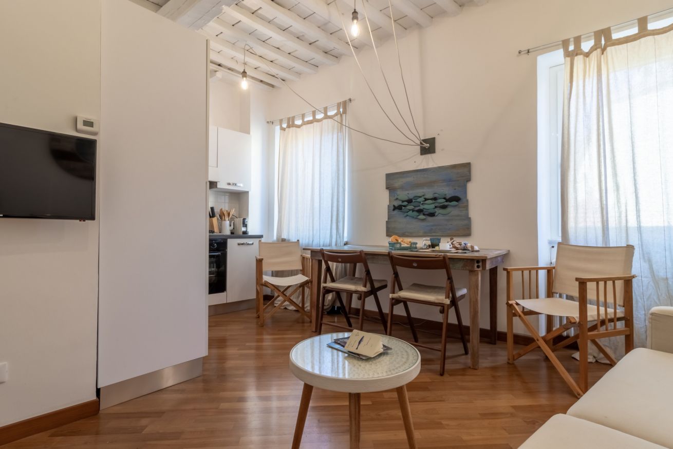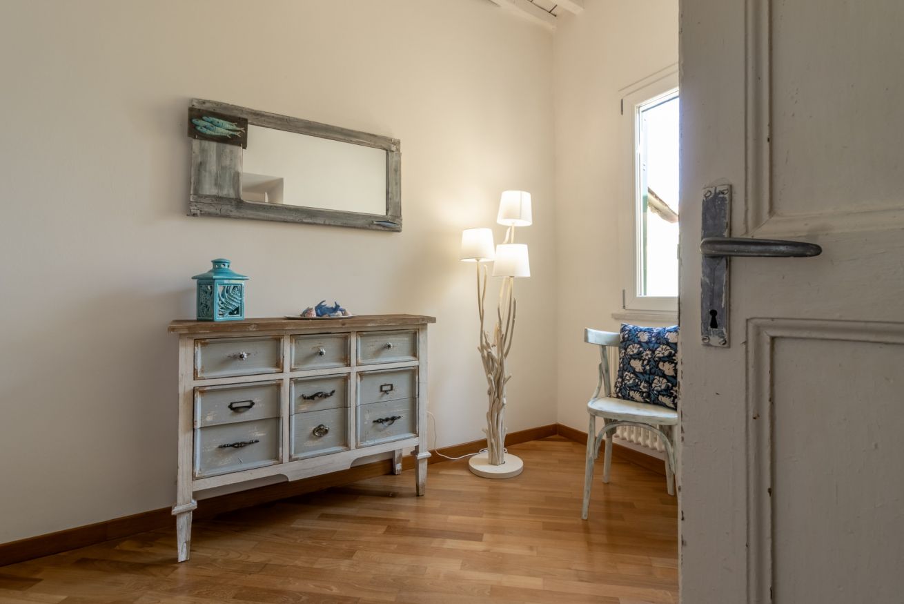 Dalla finestra della camera si gode di una piacevole vista sul mare. L’appartamento consiste in camera matrimoniale, bagno, soggiorno con divano letto, cucina attrezzata. Dotato di ogni confort. Aria condizionata nella camera da letto.